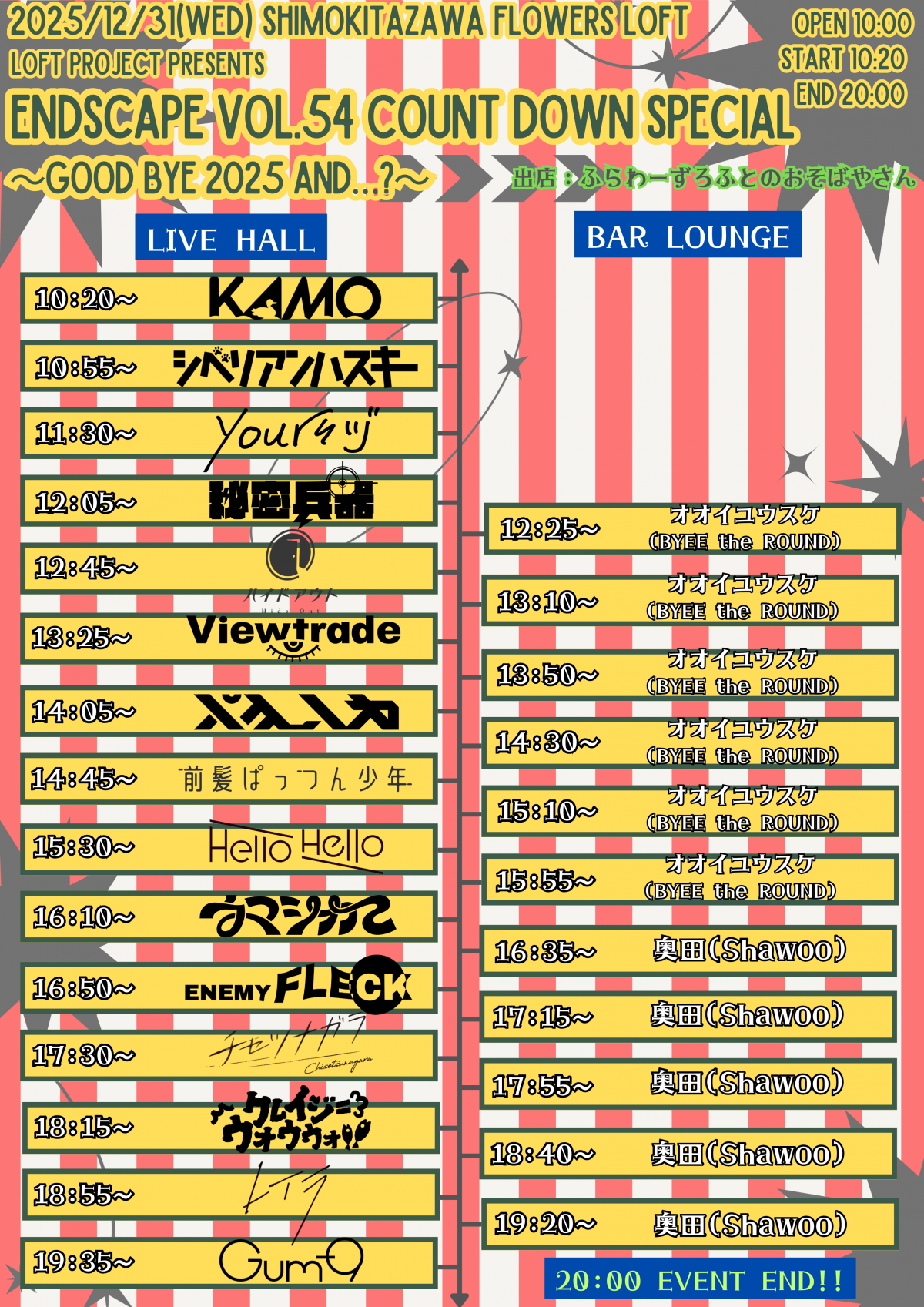 yoursヅ / ウマシカて / クレイジーウォウウォ!! / シベリアンハスキー / チセツナガラ / ハイドアウト / パキルカ / 秘密兵器 / ENEMY FLECK / KAMO / Viewtrade / 前髪ぱっつん少年 / レイラ / Gum-9 / Hello Hello / 【DJ】オオイユウスケ(BYEE the ROUND) / 【DJ】奥田(Shawoo) -
