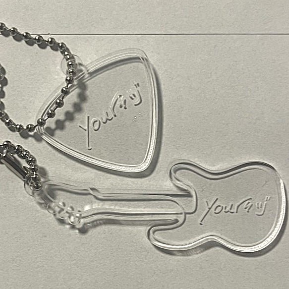 yoursヅのロゴが入った透明アクリルキーホルダー「せめて気づいてねキーホルダー」に、